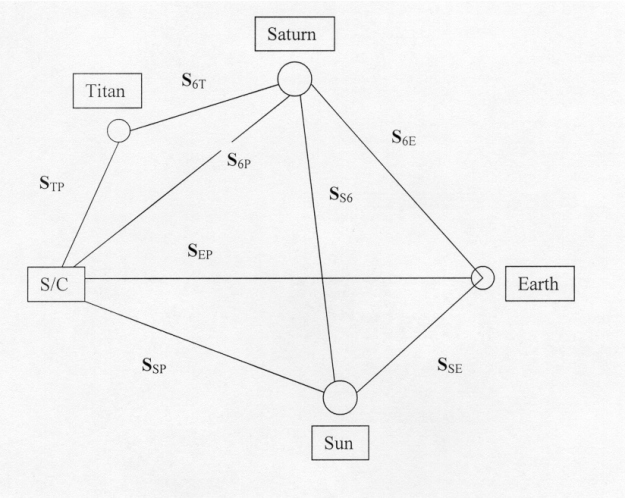 Nomenclature --> S refers to State Vector (position and velocity components) with the subscripts AB, where A is the reference or "from" body and B is the "to" body. The following body definitions are used: S - Sun; P - S/C or Probe; E - Earth; 6 - Saturn; T - Titan.