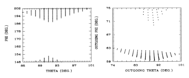 Figure 5.14. Angular distribution for energy E=320 keV. Left: at the point (-0.718812,-0.09375,-0.02384); right: at the aperture.