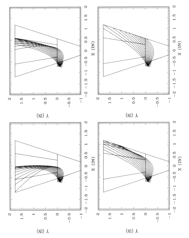 Figure 5.7. Particle trajectories emanating from the point (-0.718812,-0.09375,0.0) of the Beta detector; from l to r (in keV.); top E=80, E=160; bottom E=320, E=480.